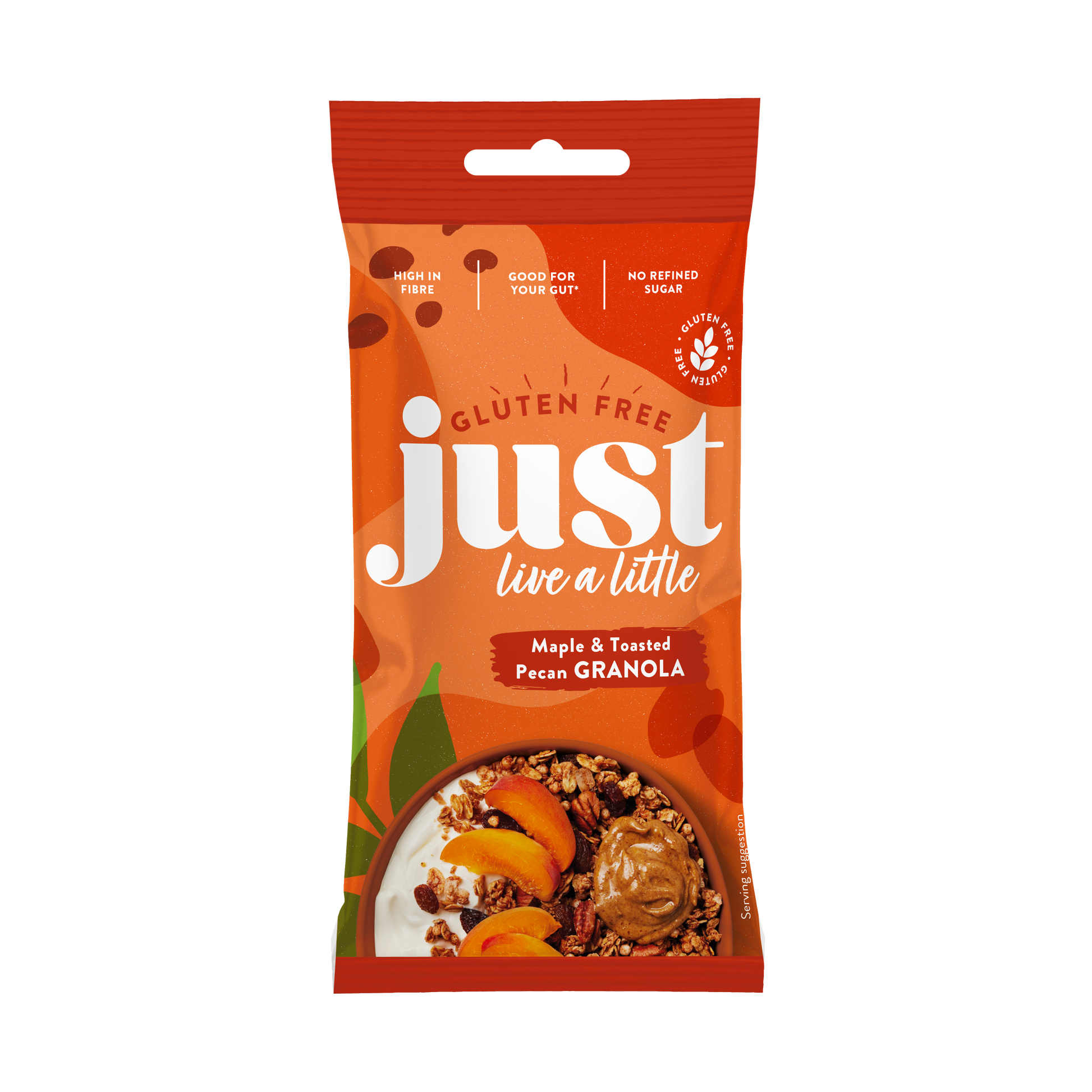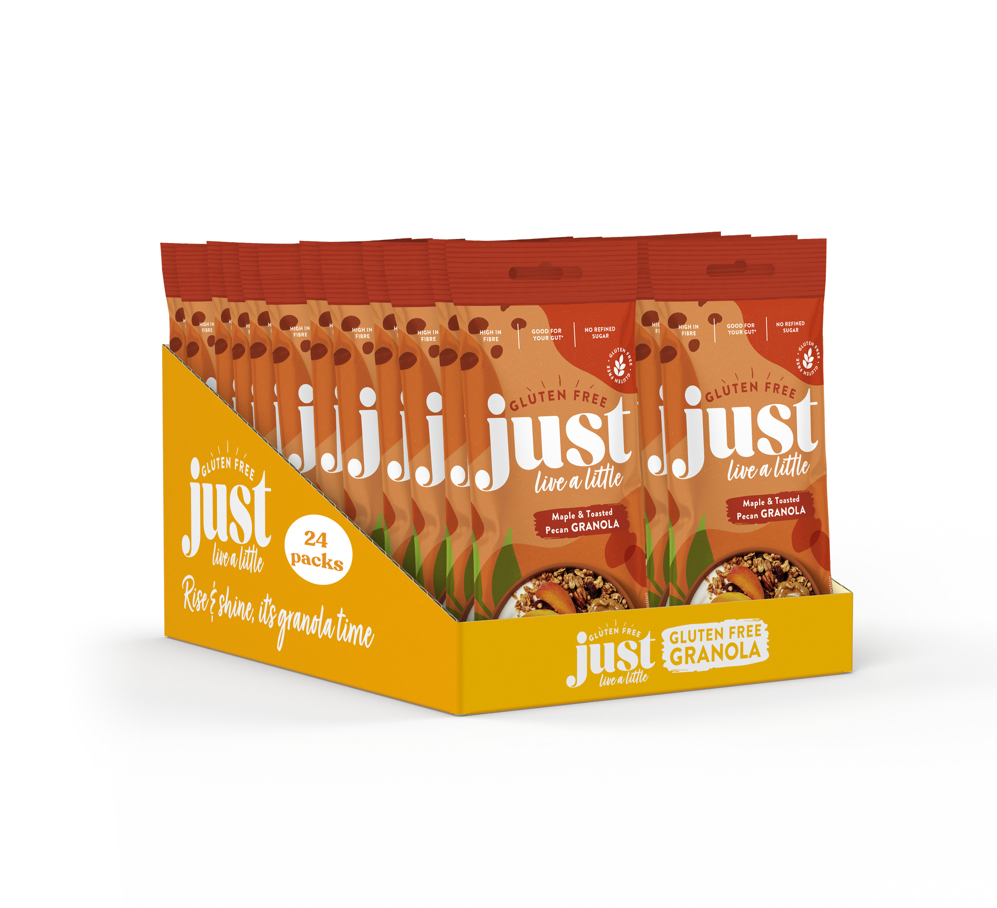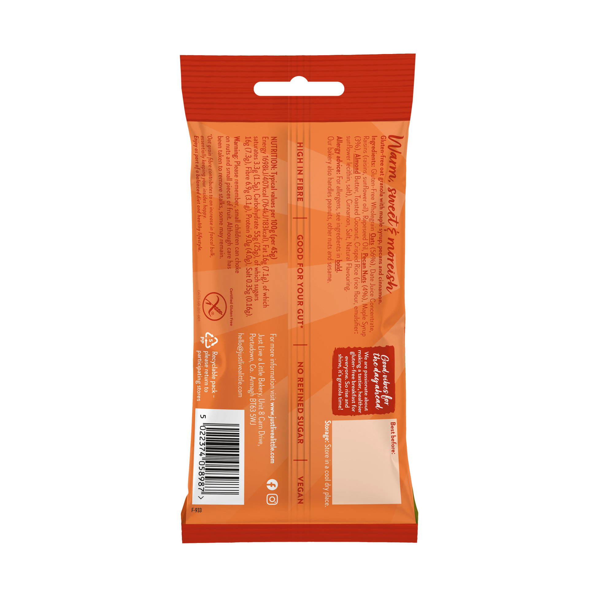Warm, sweet & moreish. Golden gluten-free maple & cinnamon toasted oats with nutty pecans, crispy coconut, juicy raisins, crisped rice and a dollop of almond butter.